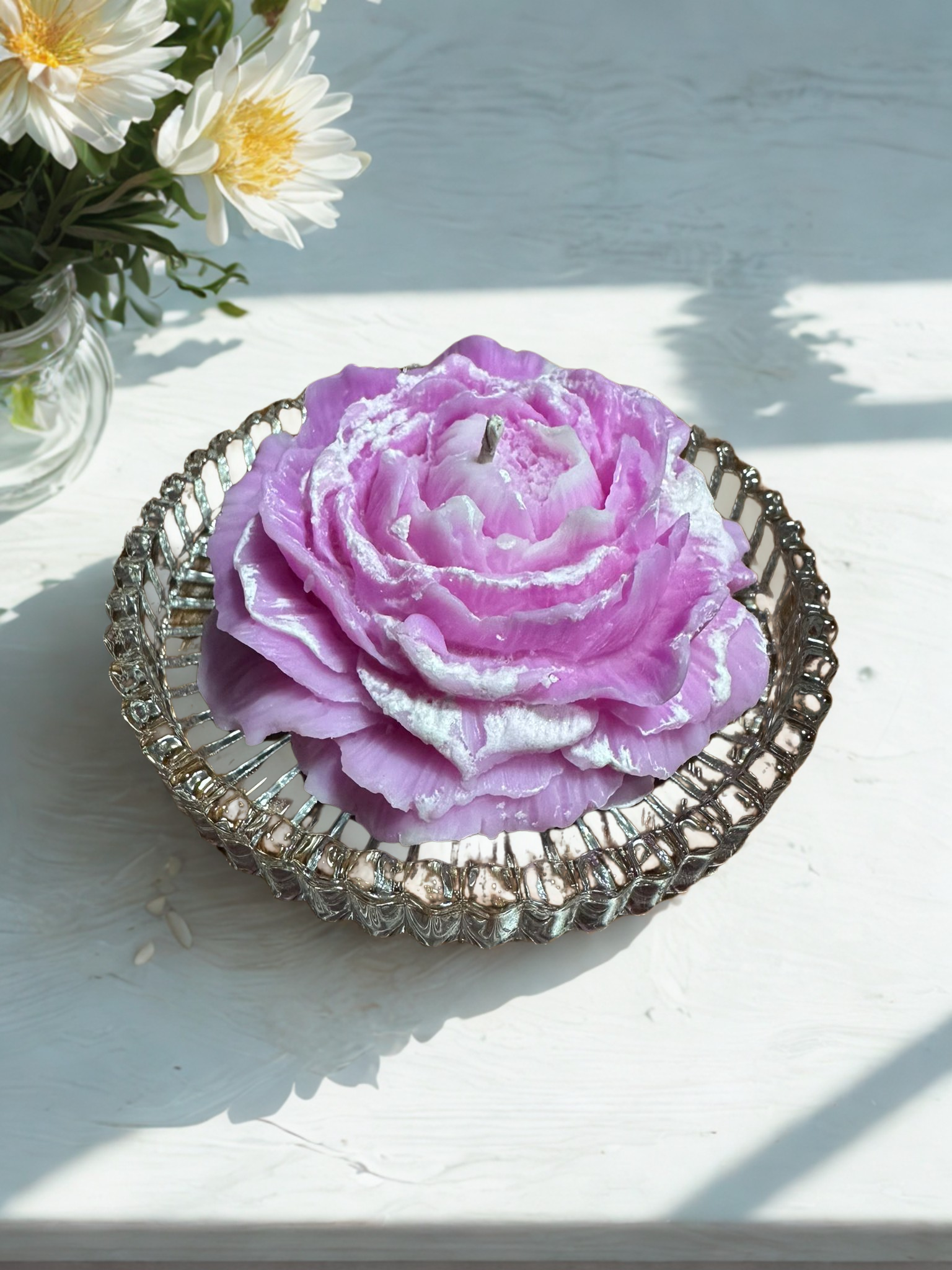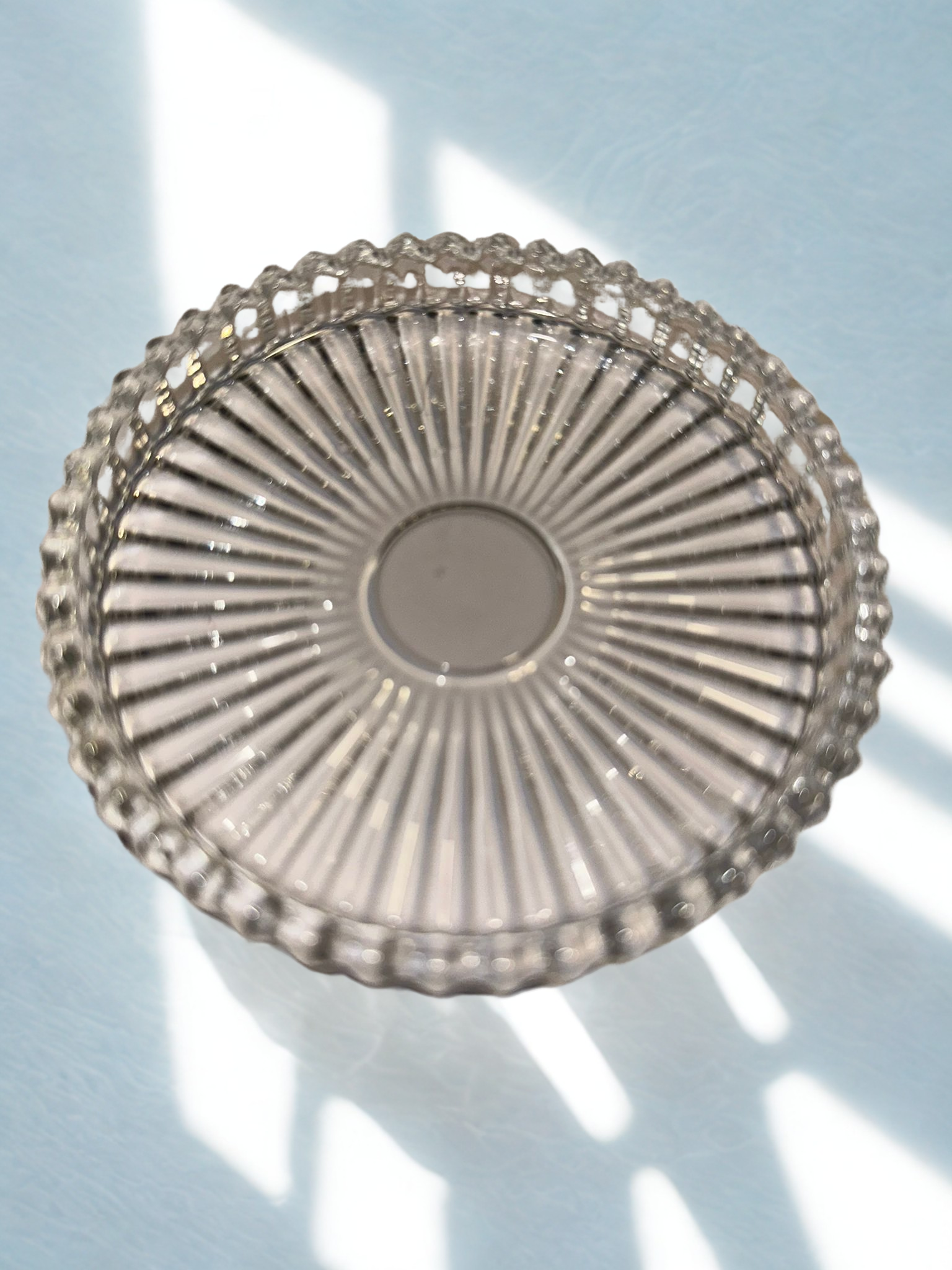 Stelle deine Blütenkerze zentriert in die Schale – der erhöhte Rand fängt überschüssiges Wachs stilvoll auf und reflektiert das Kerzenlicht wie ein kleiner Spiegel.